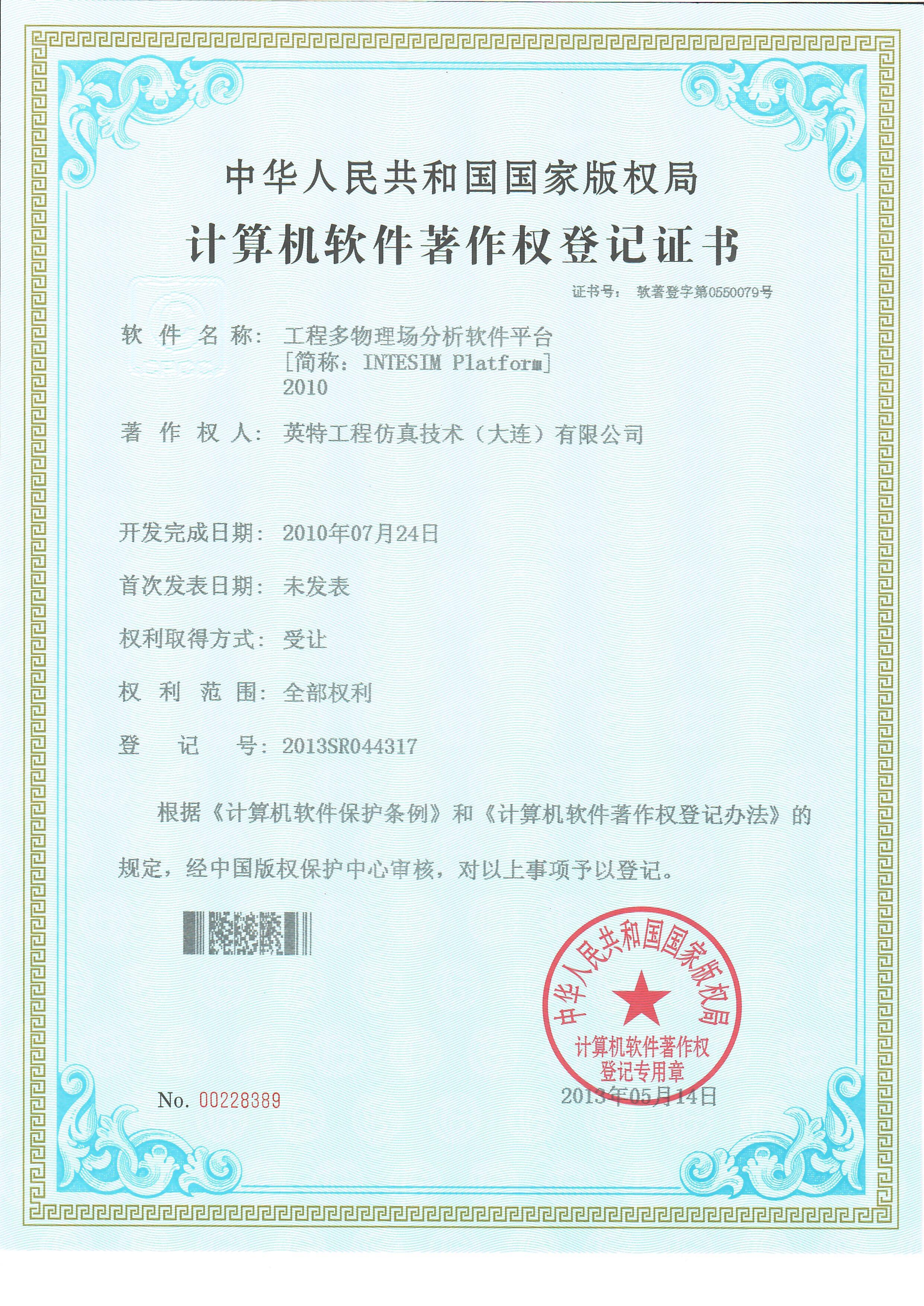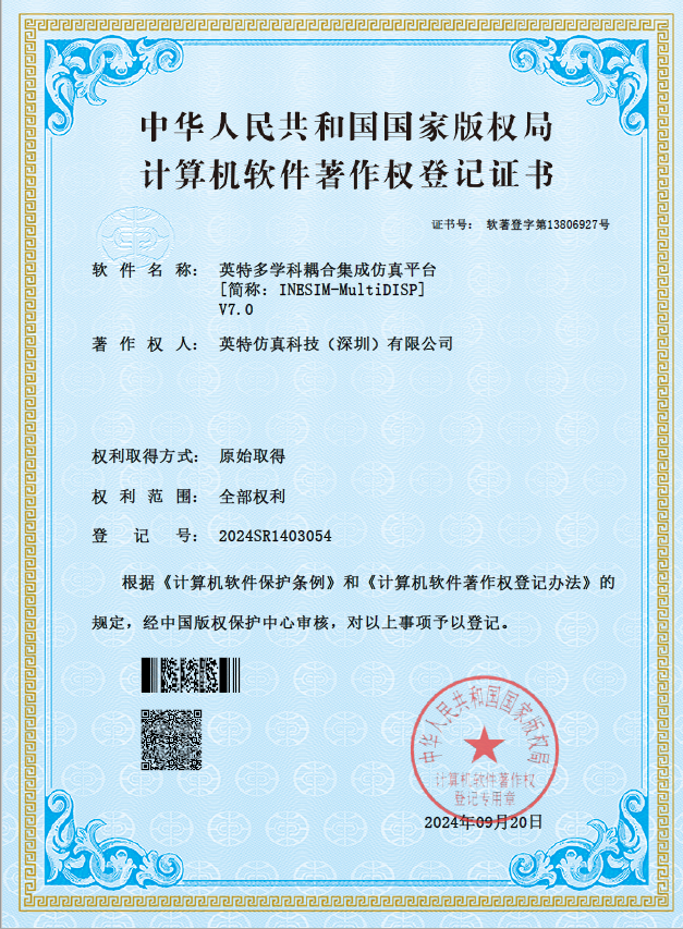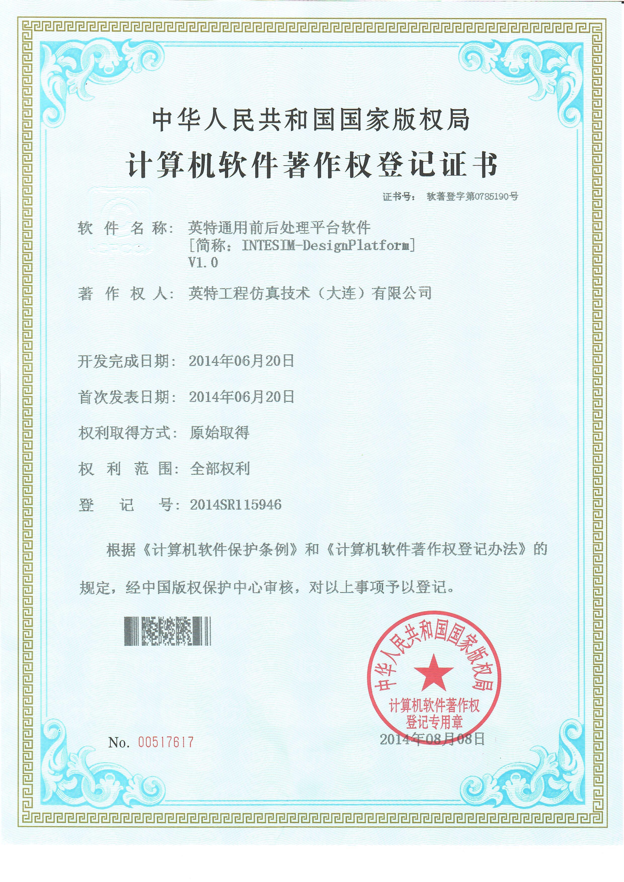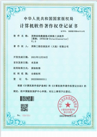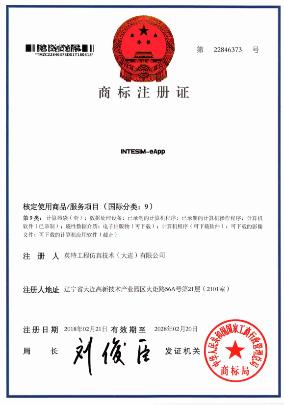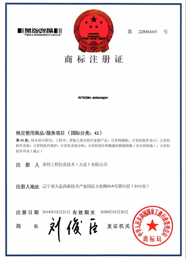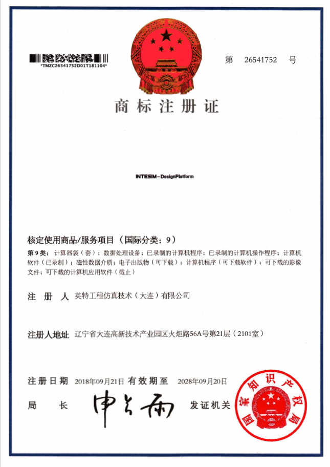 英特仿真產品已獲得88項計算機軟件著作權和29項國家發明專利,已榮獲“中國電工技術學會科技進步一等獎”、“中國機械工程學會科技進步一等獎”、“國家重點新產品”、“中國高新技術成果交易會產品獎”、 “工信部2022年工業軟件產品”、“中國國際軟件博覽會創新獎”、“中國軍民兩用技術創新應用大賽銀獎”、“2016及2017年度中國工業軟件產品獎”、“中國工業APP創新應用大賽二等獎”、大連市科技進步二等獎等榮譽及獎項。同時,英特仿真作為國內CAE軟件自主研發領軍企業已獲得第四批服務型制造示范平臺、工信部特色專業型工業互聯網平臺、國家高新區百新企業、全國硬科技之星、遼寧省專精特新小巨人企業等榮譽,并獲得GJB9001C-2017武器裝備質量管理體系、GB/T19001-2016/ISO9001:2015質量管理體系、高新技術企業等資質。